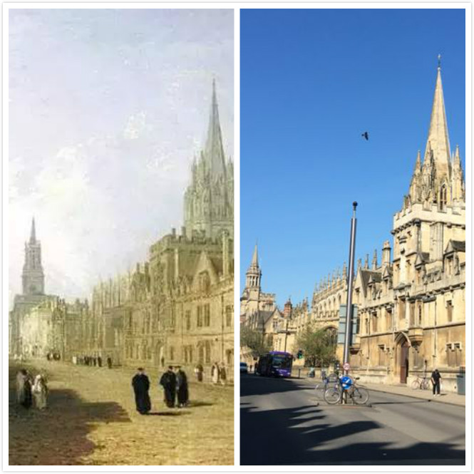 在路上,大家走过牛津高街。不禁想起1810年透纳所画的牛津高街街景,历经二百年,高街几乎没变,只是多了几分忙碌。牛津是个神奇的地方,每一步都走在遥远的历史上,时光仿佛停滞,上百年的印记随处可见。时间又似乎跨越到未来。大师们却眼望未来,为未来更美好世界奋斗着。