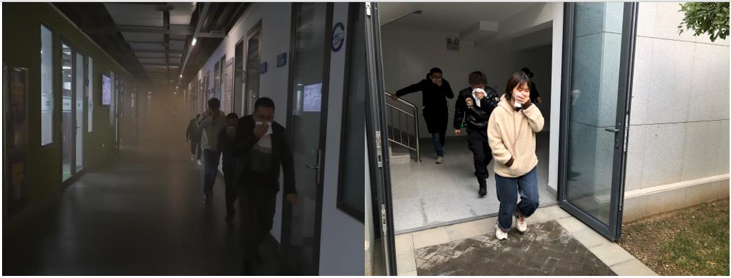 伴随着烟雾弹点燃,消防演练正式拉开了帷幕。浓烟弥漫在走廊,安全员吹响口哨提醒火情发生,师生用湿毛巾捂住口鼻,在各楼层安全员指挥下,低腰有序撤离到安全区域。全院师生撤离共用时4分钟。