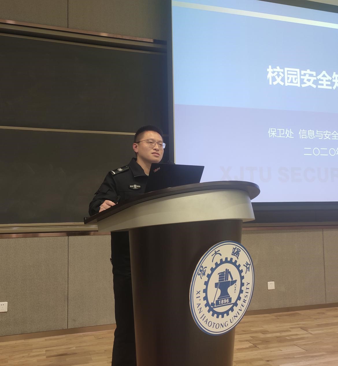 杨剑首先向同学们介绍了几例诈骗与火灾事故案例,从思想上为大家敲响警钟。他还针对如何维护人身安全、预防诈骗、远离校园贷、预防火灾、维护国家安全等几个方面做出了细致的讲解。他希望同学们掌握防范知识,提高防范意识,做遵纪守法的好公民,做爱国爱校的好学生,做西迁精神的新传人。
