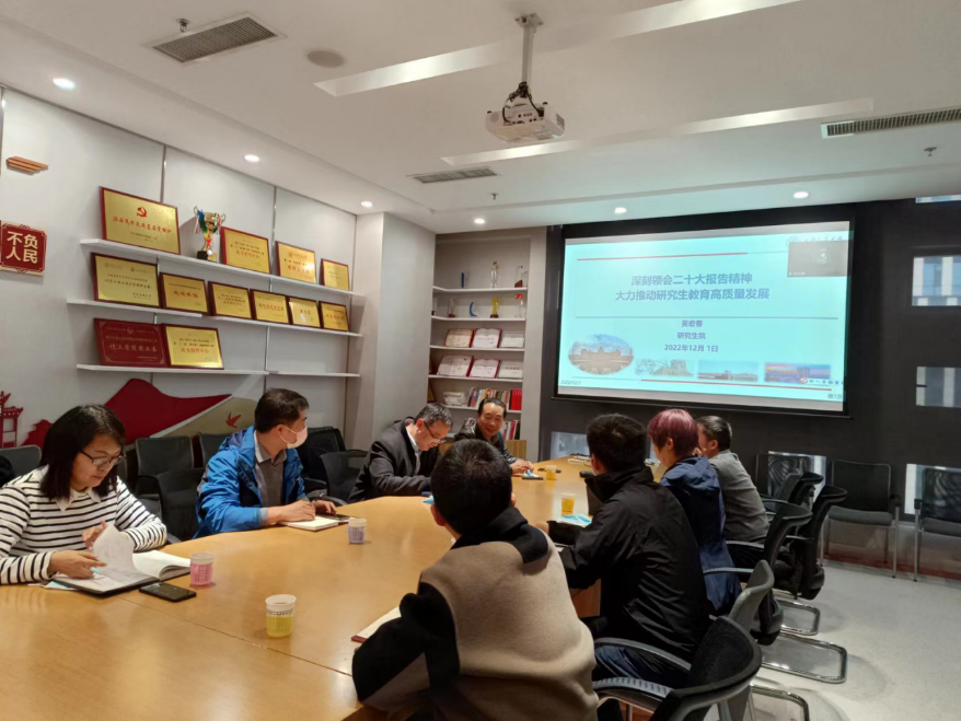 为深入学习领会贯彻落实党的二十大精神,提高人才培养质量,12月1日下午,国产直播在创新港19-3183会议室召开了中心组学习暨教职工党支部书记例会,会议邀请研究生院常务副院长、吴宏春教授做题为《深刻领会二十大报告精神大力推动研究生教育高质量发展》专题辅导报告,会议由分党委书记苗晋英主持,院领导班子成员、党委委员、教职工党支部书记参会,90多名教职工线上观看。
