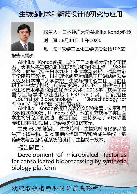 Akihiko Kondo教授,毕业于日本京都大学化学工程系,长期从事生物炼制和生物制药的研发工作。1988年至今,他先后担任日本九州工业大学副教授、瑞典皇家工学院客座教授、日本理化研究所细胞工厂课题组领头人以及日本神户大学教授、生物炼制中心主任,目前任职于神户大学科技与创新研究院。2013年,他获得了日本生物技术学会颁发的优秀论文奖;2015年,获得了美国专业与学术杰出出版(PROSE)奖。目前担任“Journal of Biotechnology”、“Biotechnology for Biofuels”等14个国际期刊的编委。