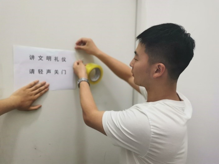 为了解决此问题,为师生们办实事,硕9133党支部组织支部成员,打印警示标语,言明利害,并将警示标语粘贴于小门显眼位置,确保每个开门的学生都可以看到警示标语,从而轻声关门,缓解关门问题。在标语粘贴后,主动轻声关门的人数显著增加,问题得到有利缓解。